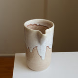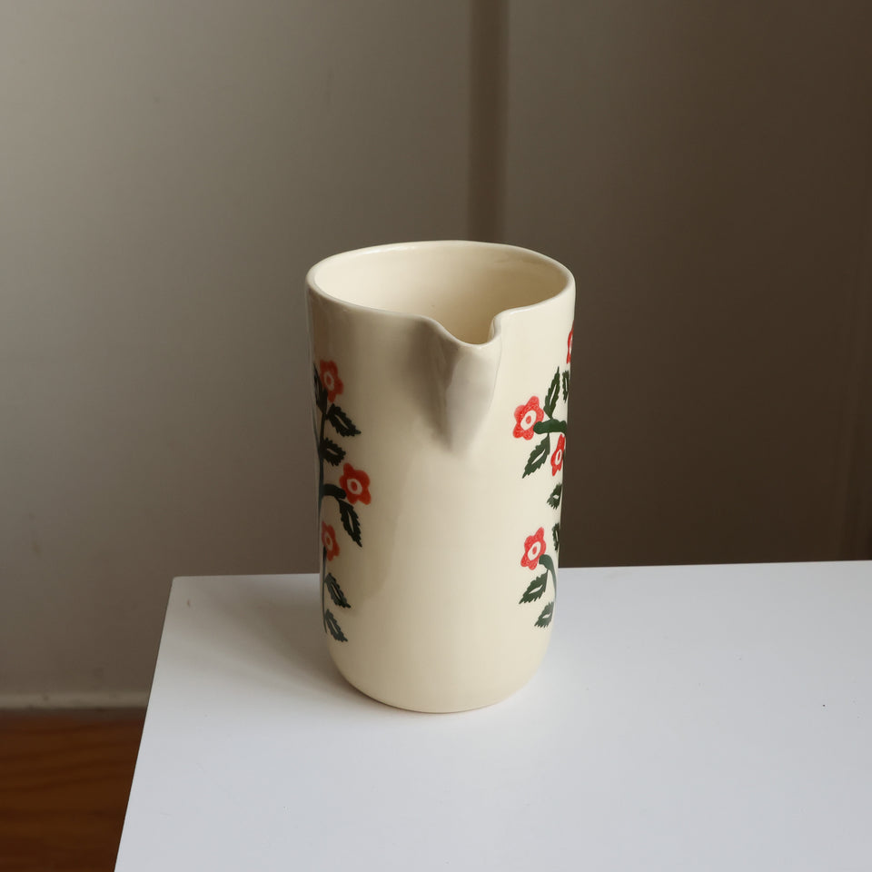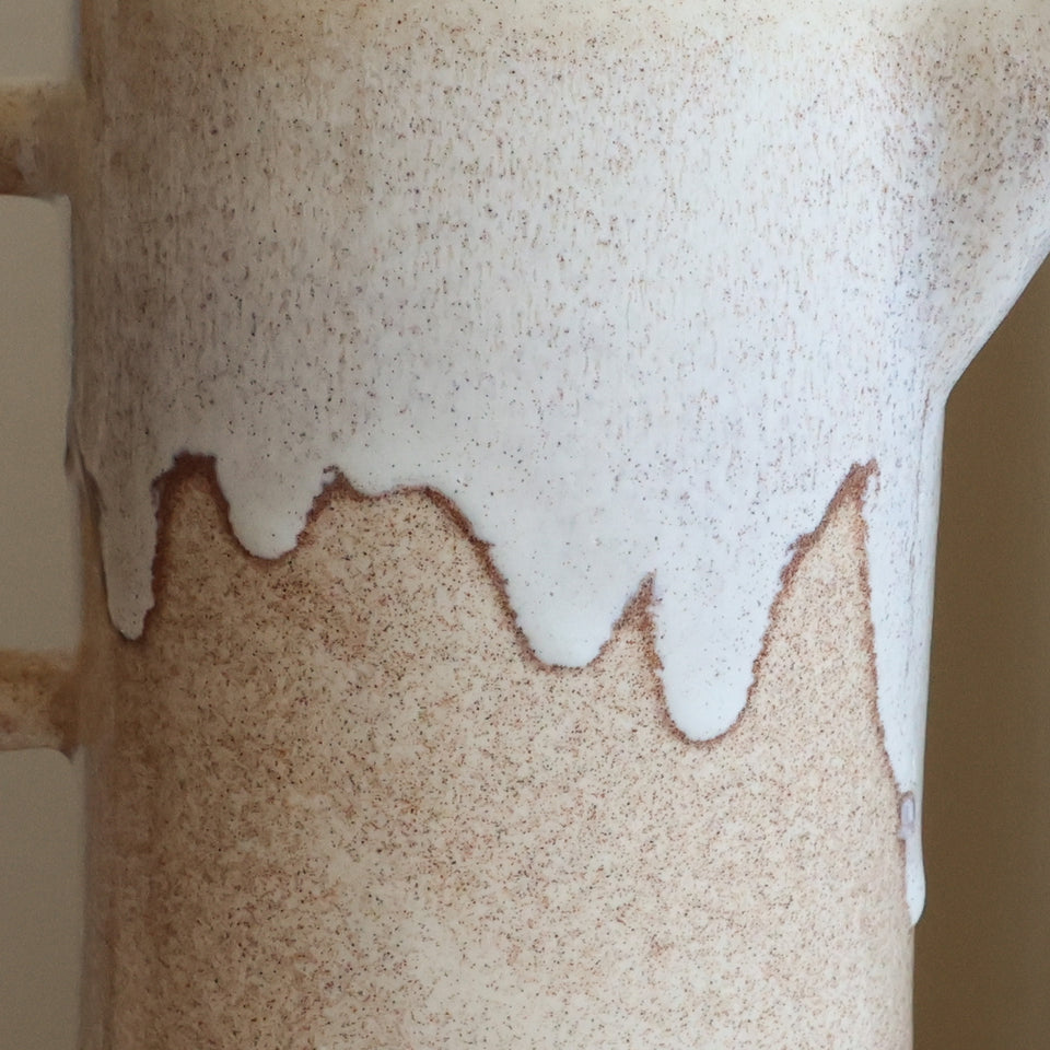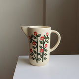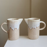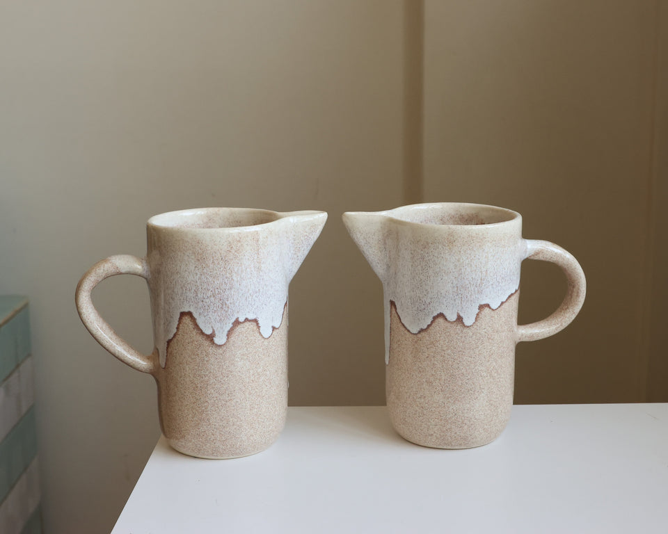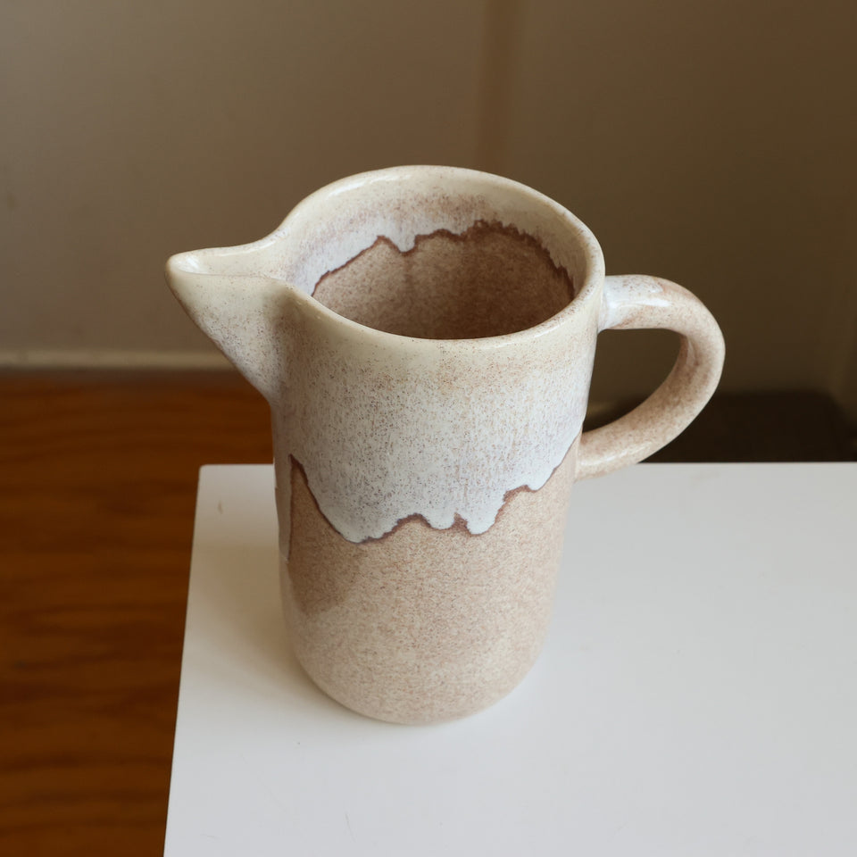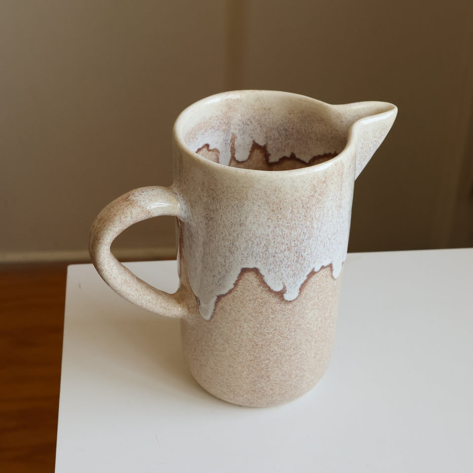 Tall stoneware pitcher. 7.5" tall, 4" across the top. Handle shape may vary slightly.