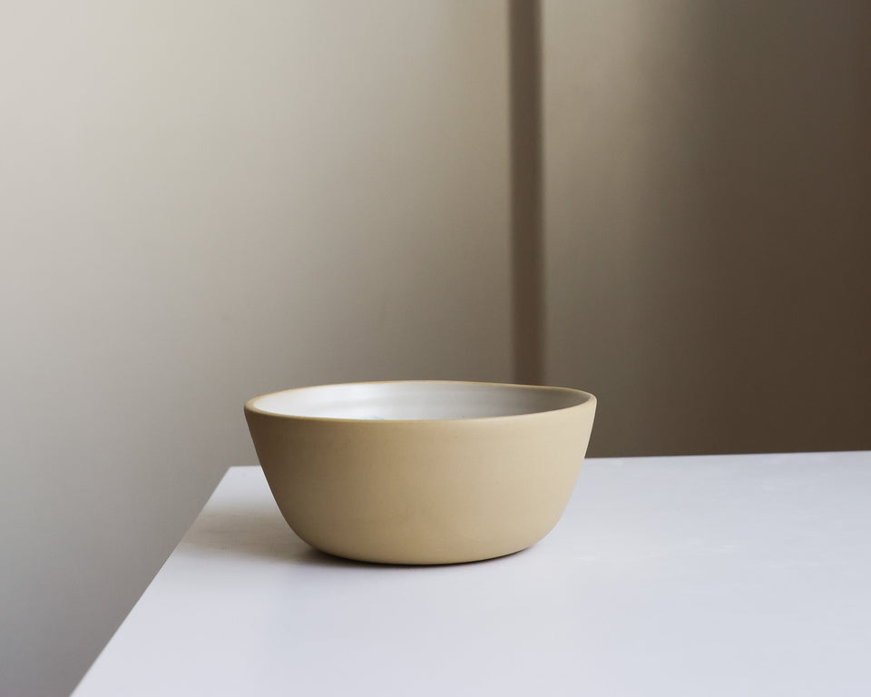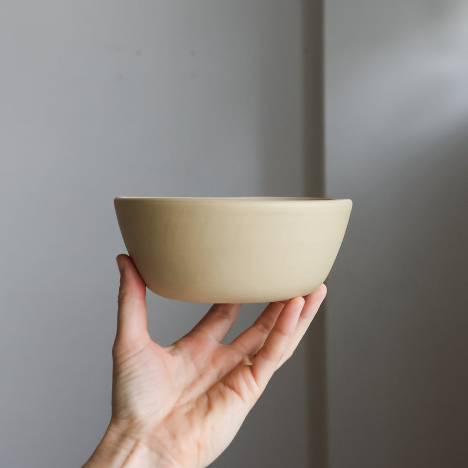 Stoneware plate in white or toasty tan. The underside and lip are unglazed. 10.5" across with a sloped lip and a stable foot ring. Dishwasher and microwave safe, and designed for everyday use.