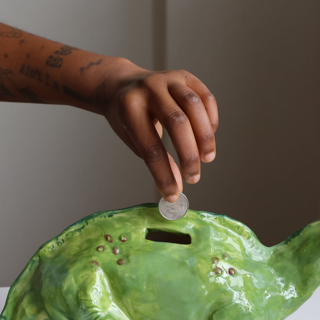 Super limited edition earthenware functional sculpture: a long necked dinosaur with a slot for coins and bills, and a corked hole on the bottom to retrieve your riches. Hand painted in vibrant colors, with a glossy glazed finish. Like us all, each creature is one of one.
