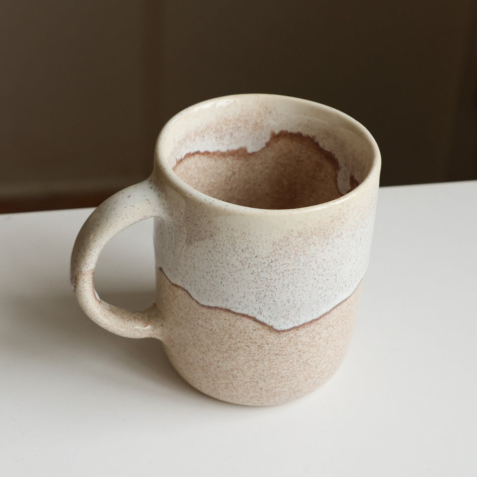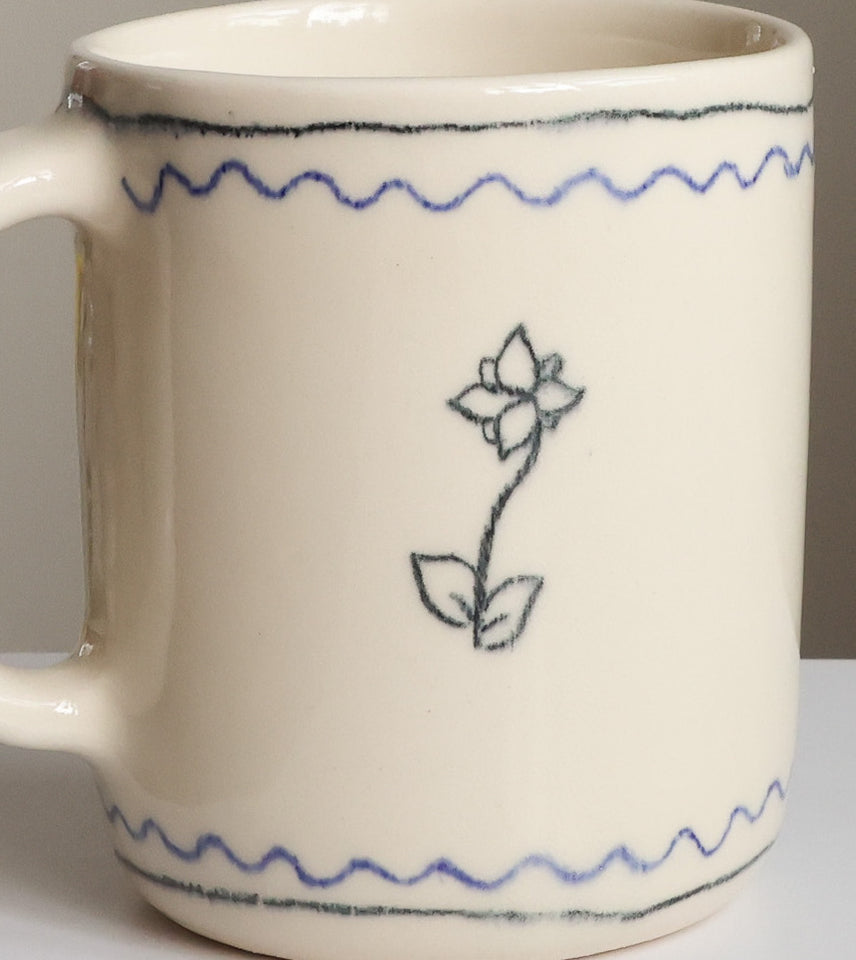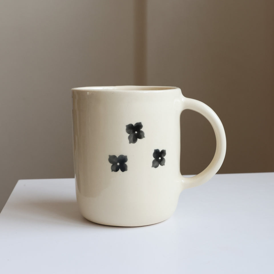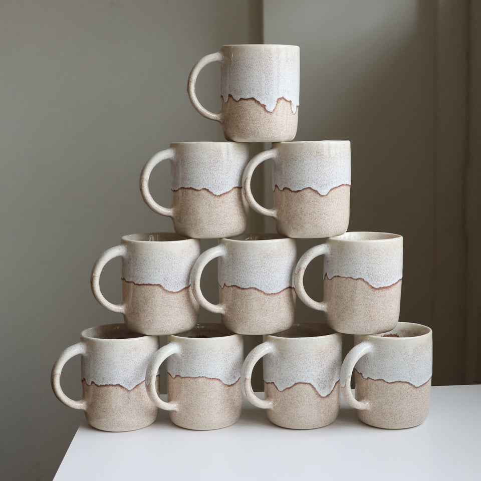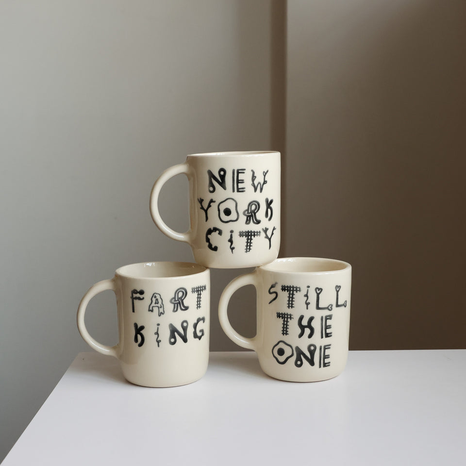 The Giant mug holds a substantial 18oz, and has a spacious handle which accommodates a four-finger hold. Made from durable white stoneware, dishwasher and microwave safe. Measures 4" wide x 4.5" tall.