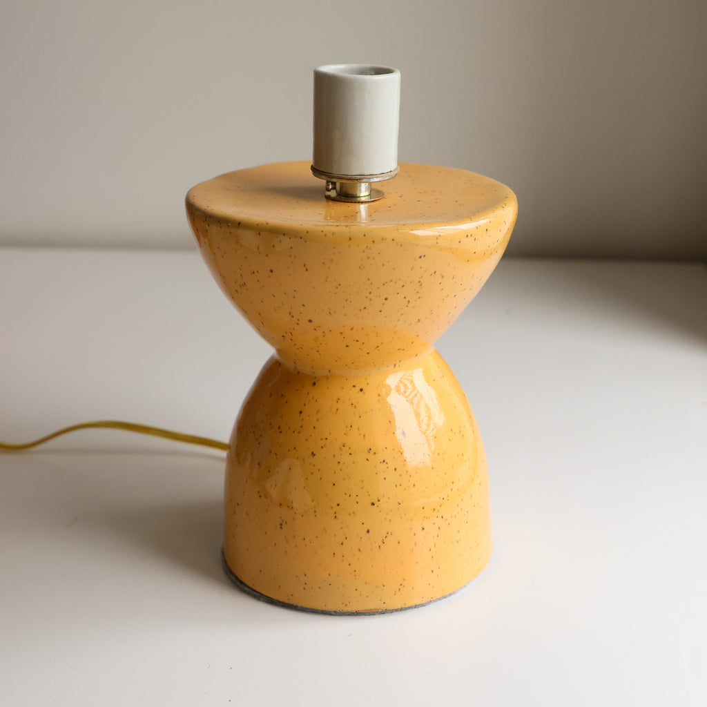 Peachy glazed, speckled stoneware base thrown on the wheel, paired with truly wild, party girl, molded plastic shade. Switch on cord, porcelain socket fits a standard E26 bulb (not included)