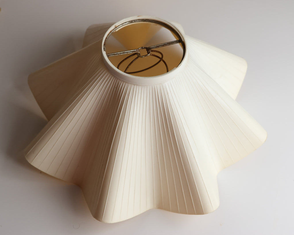 Shade notes: this antique shade is made of semi-rigid plastic and clips on to the bulb. The metal clip mechanism has some slight rusting and the inside has some yellowing. Never seen a shade quite like this one!