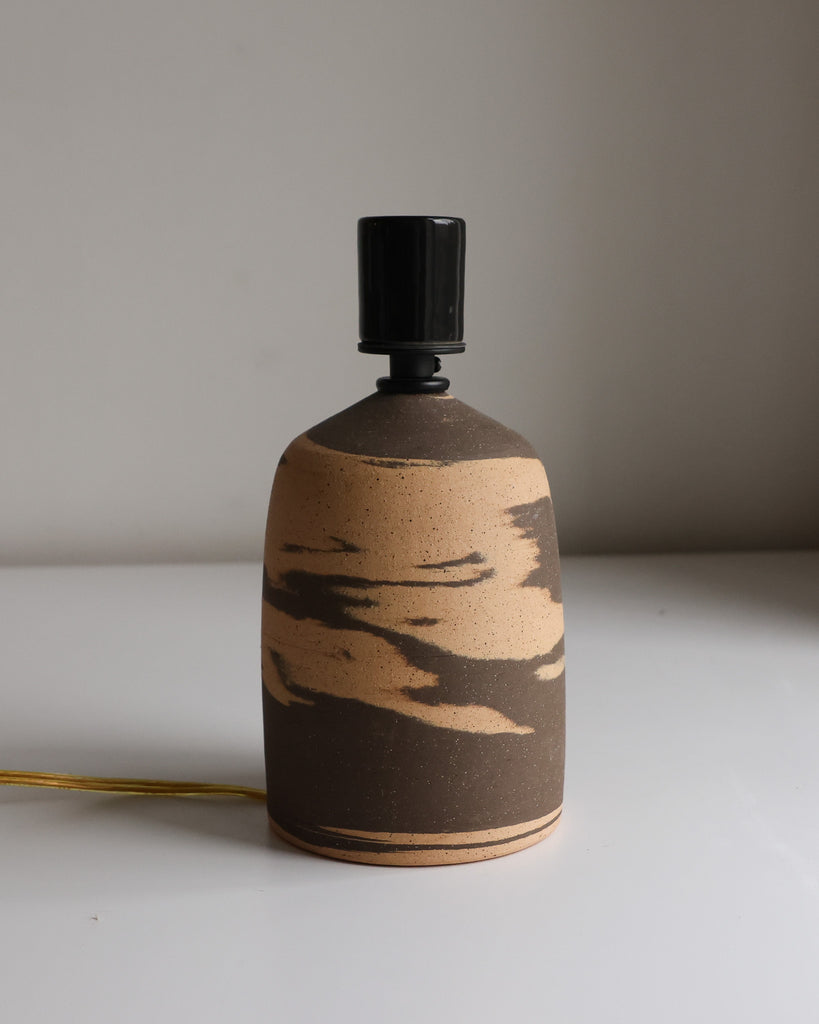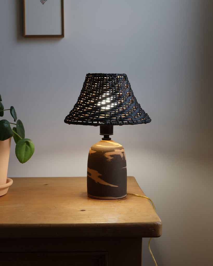 Unglazed marbled stoneware base thrown on the wheel, paired with a wicker shade. Switch on cord, porcelain socket fits a standard E26 bulb (not included).