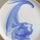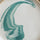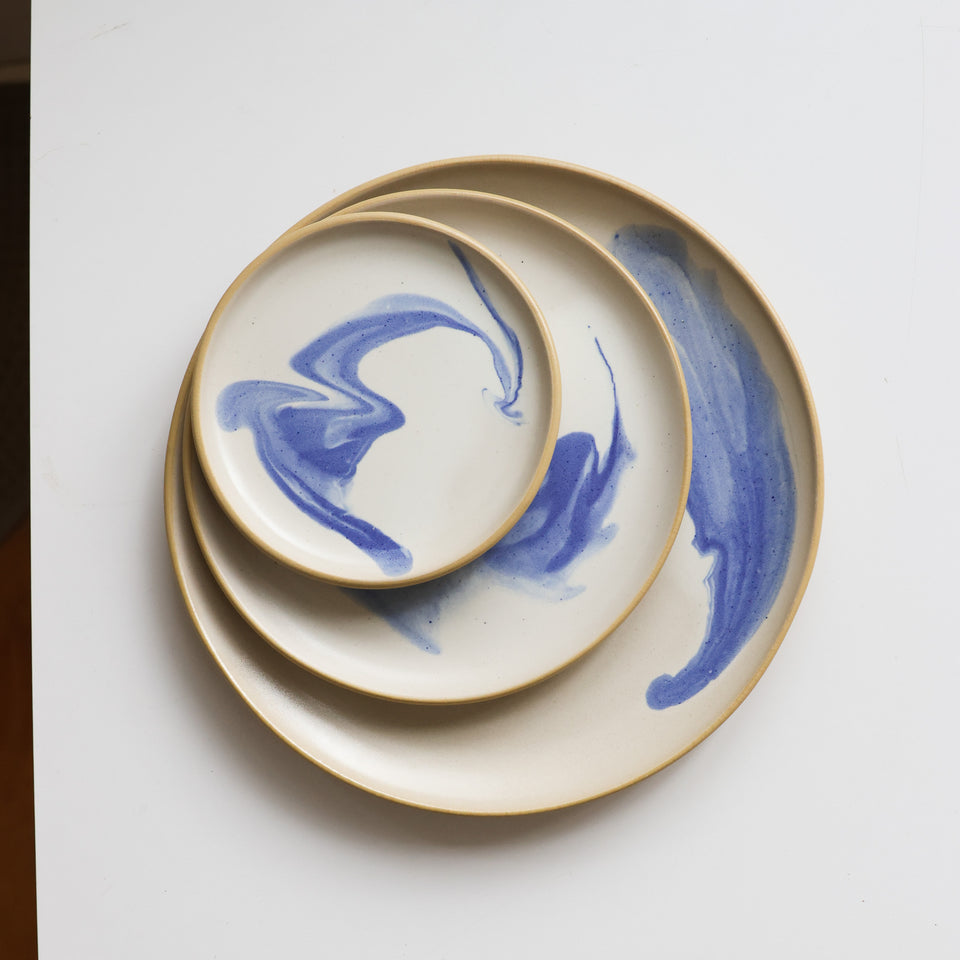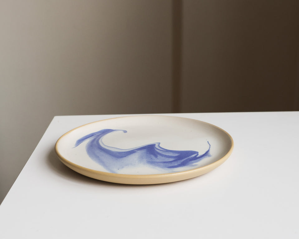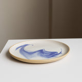 White glaze with a blue swirl, on smooth tan stoneware. Stillness in motion.
