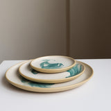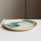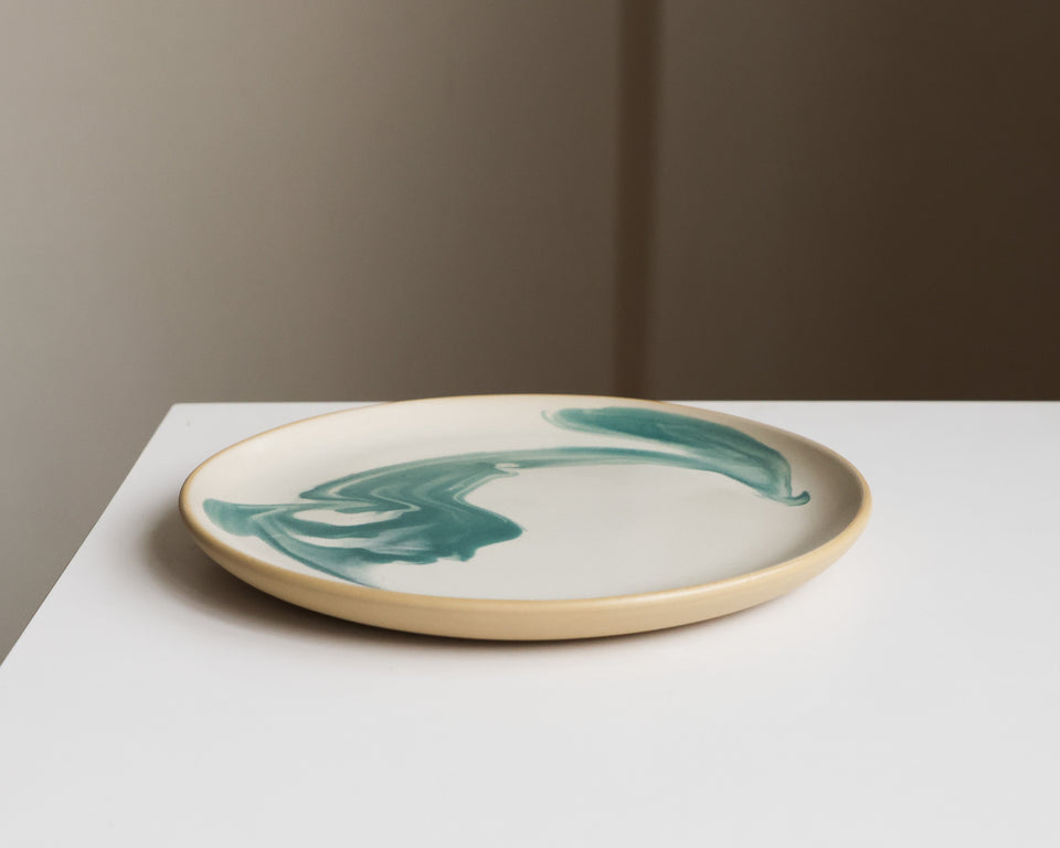 White glaze with a rich dark green swirl, on smooth tan stoneware. Verdant.