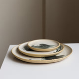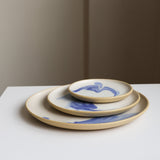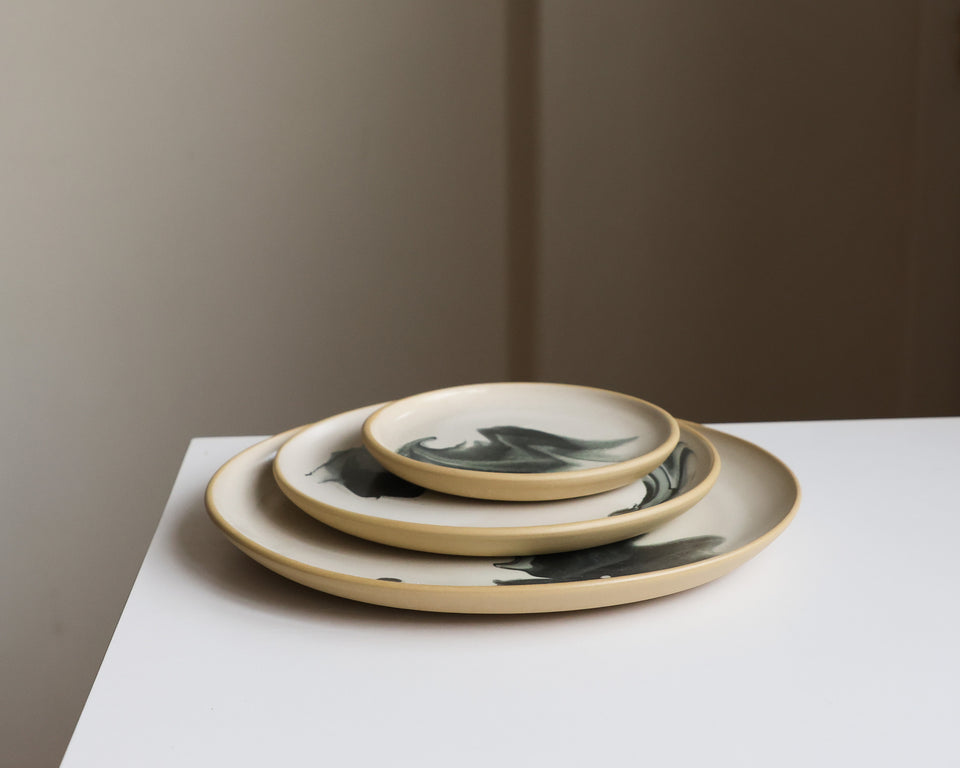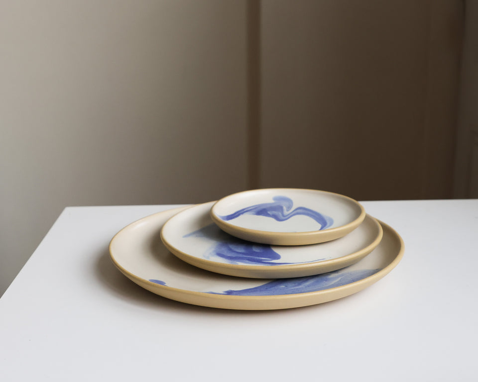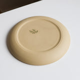 Stoneware plate in white or toasty tan. The underside and lip are unglazed. 10.5" across with a sloped lip and a stable foot ring. Dishwasher and microwave safe, and designed for everyday use.