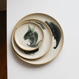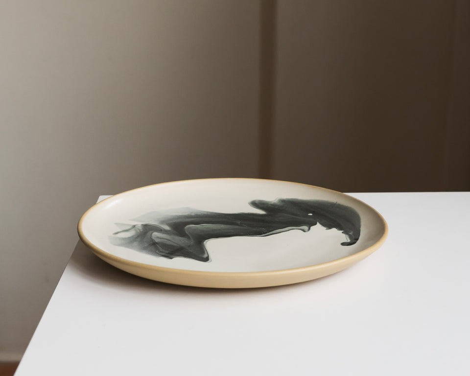 White glaze with an inky black swirl, on smooth tan stoneware. From the depths.