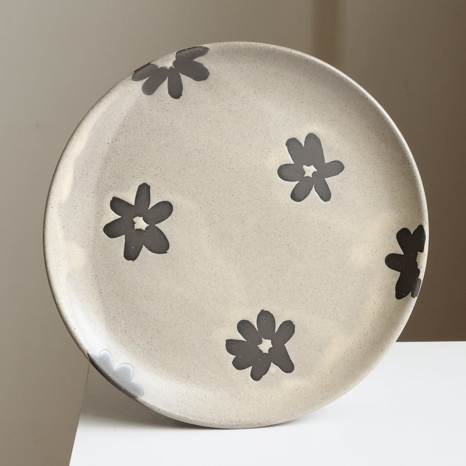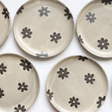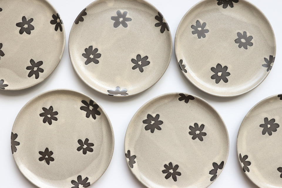 Wax resist flowers reveal the rich, dark brown stoneware clay underneath this peachy, offwhite glaze. Flower shapes are unglazed so there is a lovely textural difference.