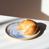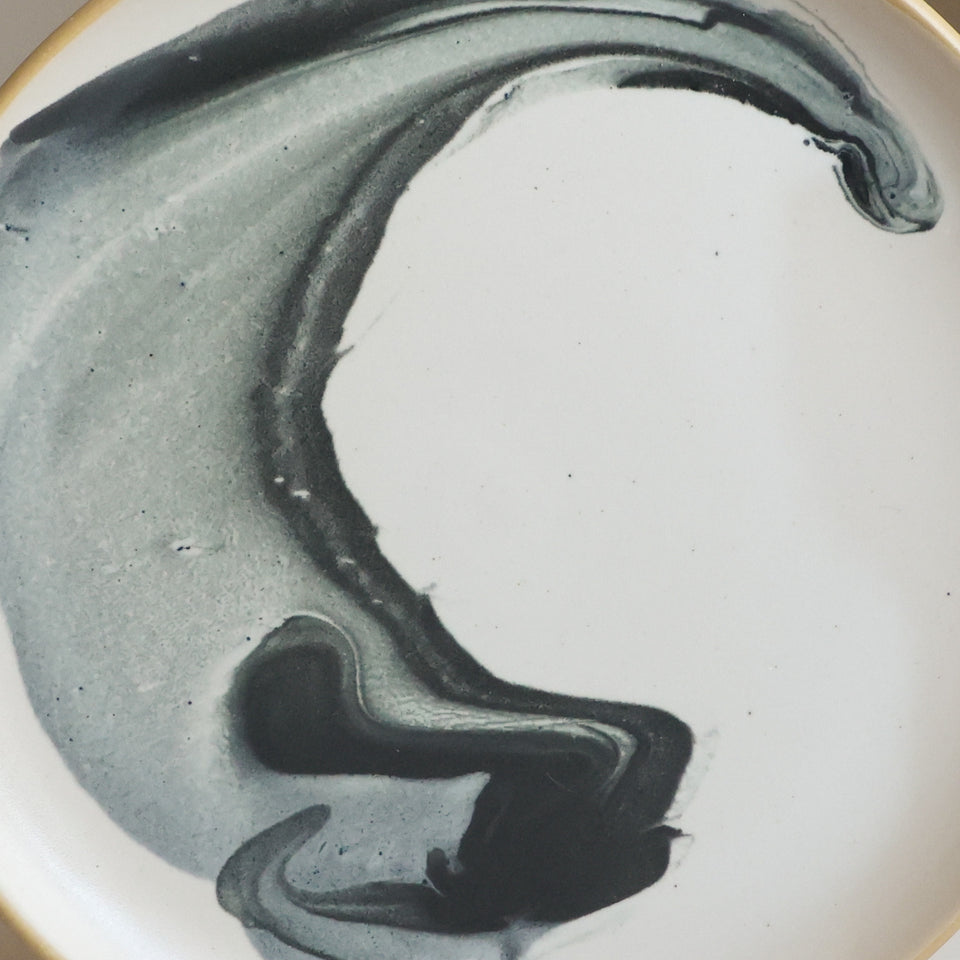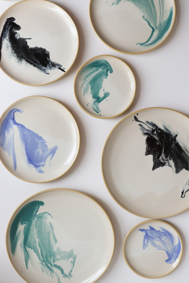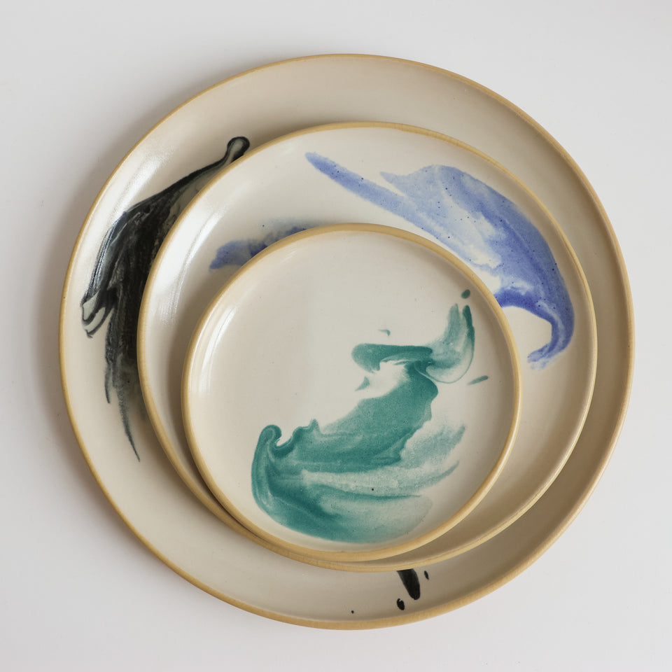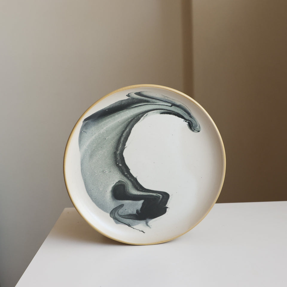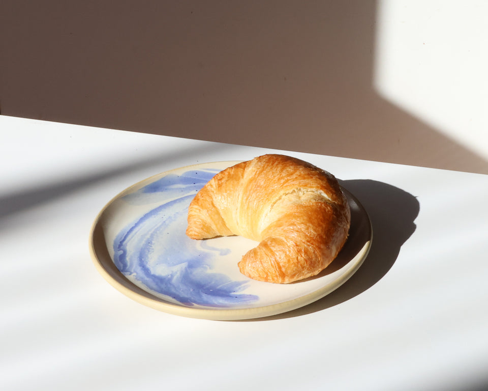 A versatile, medium sized plate: equally at home with toast and eggs or a lunch taco. 8" across with a sloped lip and a stable foot ring. Dishwasher and microwave safe, and designed for everyday use.