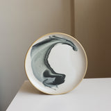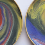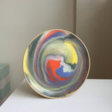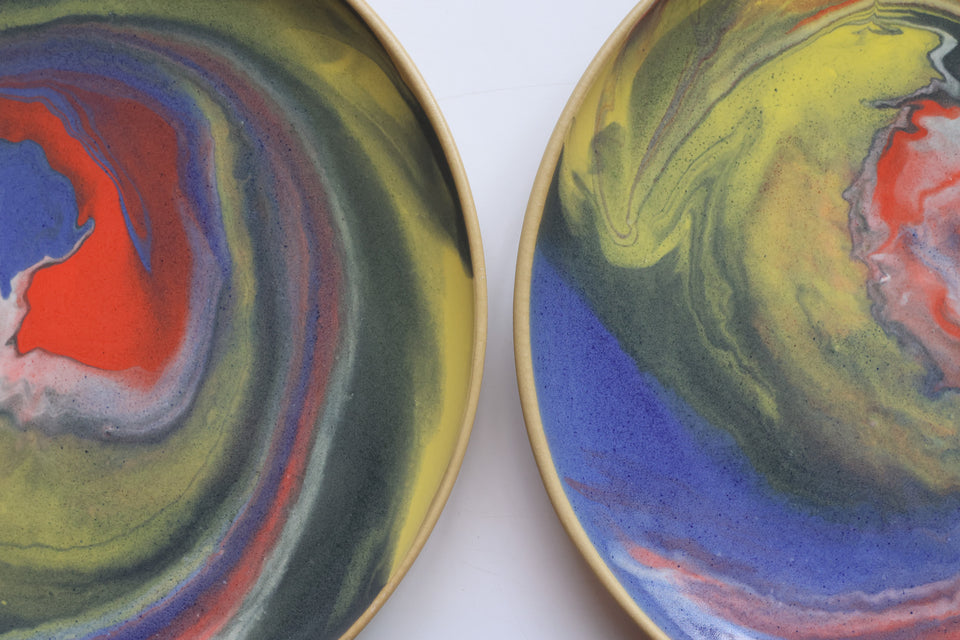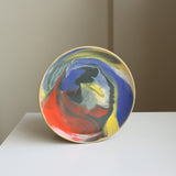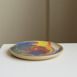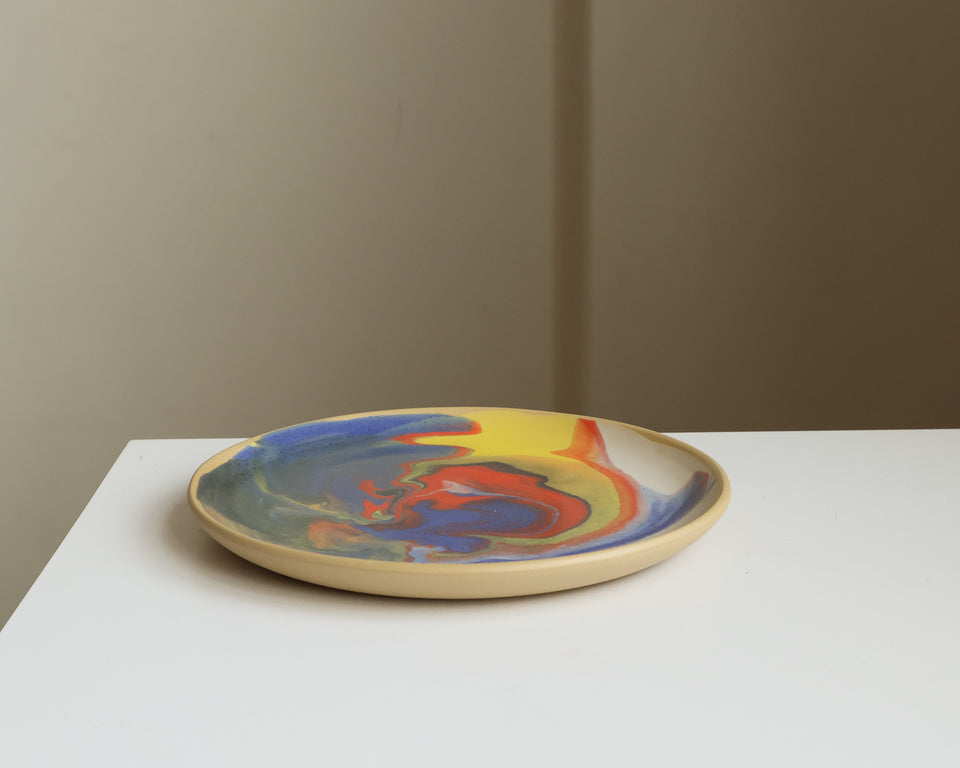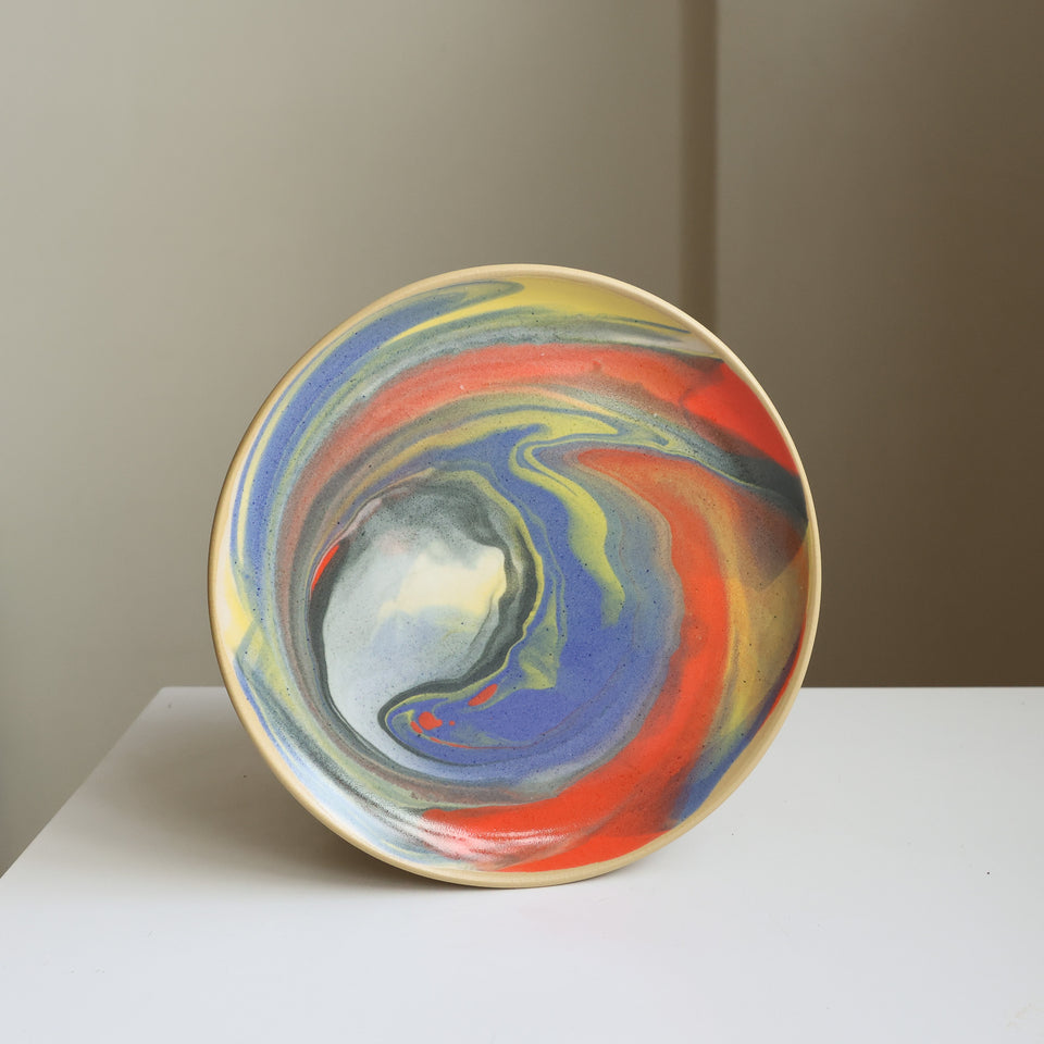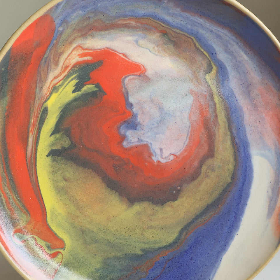 Multicolored swirled and marbled glazes on a tan stoneware plate. Intergalactic!