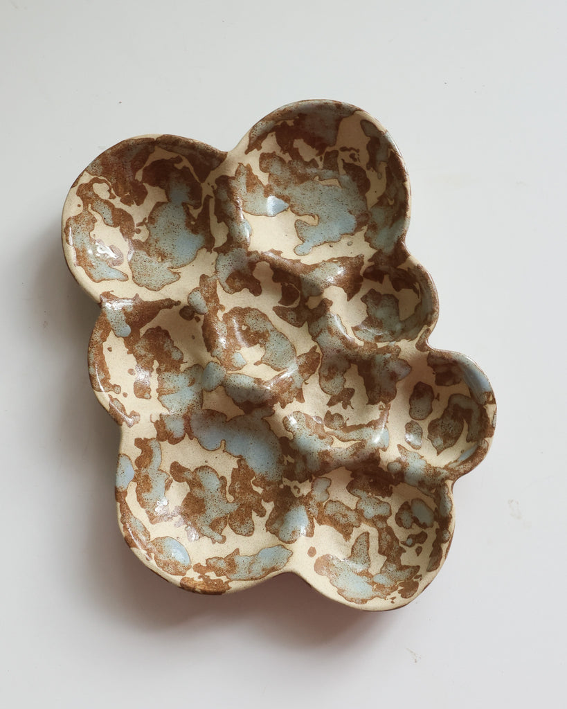Stoneware dish with 9 little sections for jewels, gems, and doodads. Sponge patterned blue-brown mottled glaze contrasted with raw, unglazed clay.