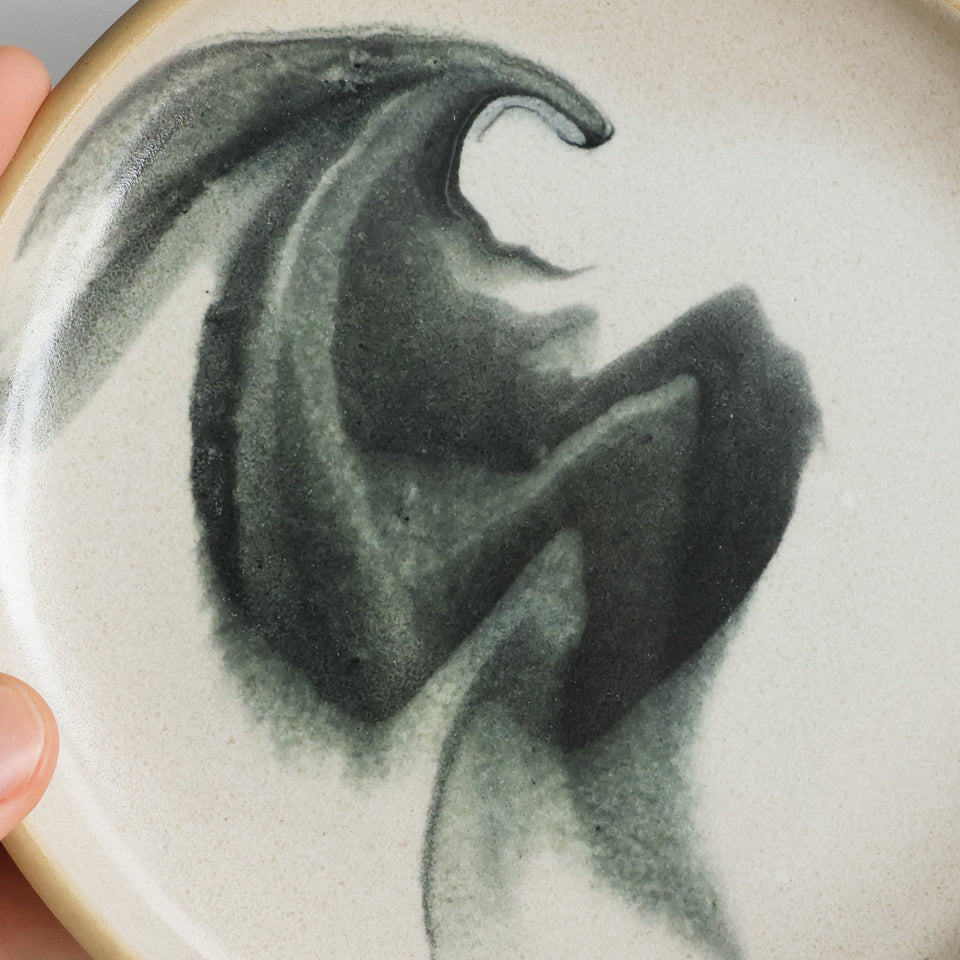 White glaze with an inky black swirl, on smooth tan stoneware. From the depths.