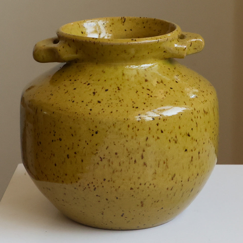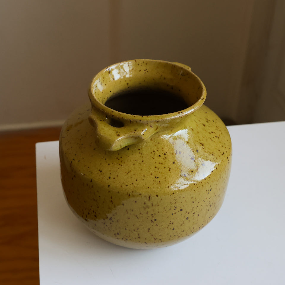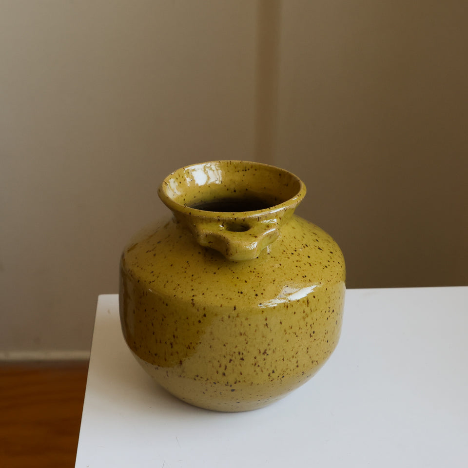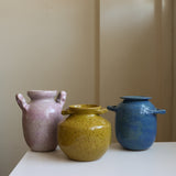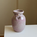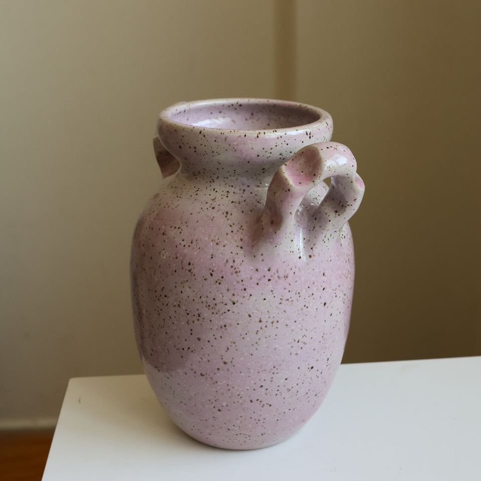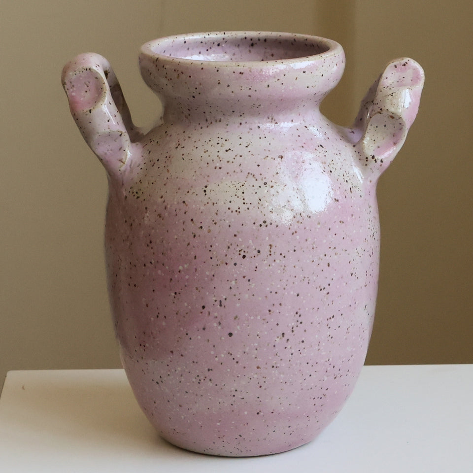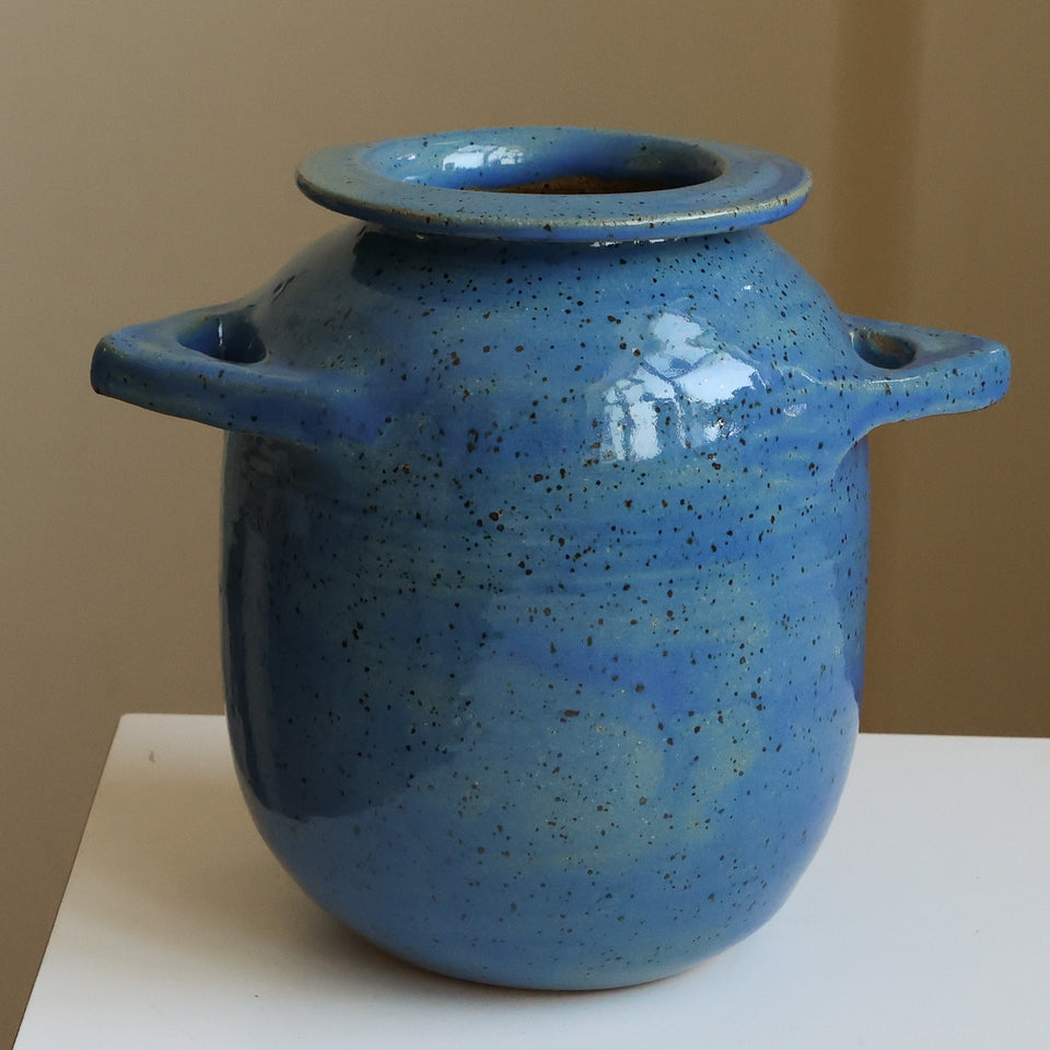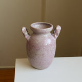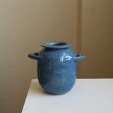 Wheelthrown vase with intricate handles, made from a speckled stoneware that is amplified by the jewel toned glazes. 6- 7.5" tall.